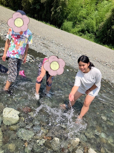 川へ入り第一声「つめたーい!!」とみんな水の冷たさに驚き!!川の流れに逆らってみたり、横になってみたりと、各々楽しそうに遊んでいました🎶